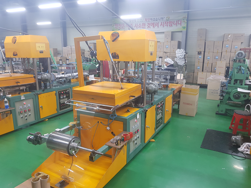 겟도바시 성형기는 성형 과정에서 플러그를 이용해 가열된 원단을 금형쪽으로 기계적으로 눌러내는 형태로 성형합니다.